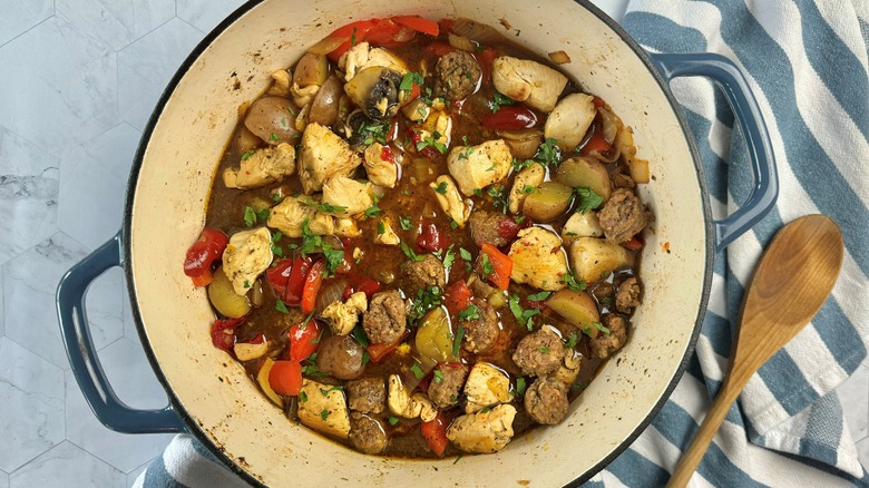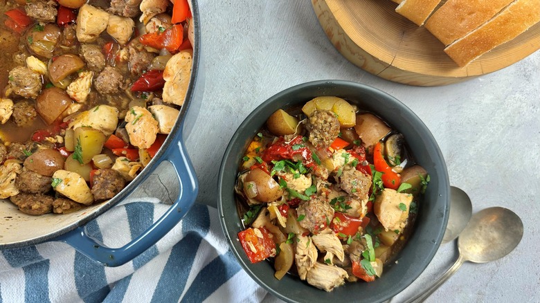 Another way to change up the stew is to amp up the heat level. You can do this either by using hot Italian sausages in place of mild ones or by supplementing the Peppadews with something spicier like hot cherry peppers. You could also tweak the consistency of the stew a bit. "I prefer to keep the base as more of a broth," De Witt says, "but if a thicker stew is more to your liking, you can dredge the chicken in flour before browning to achieve this."