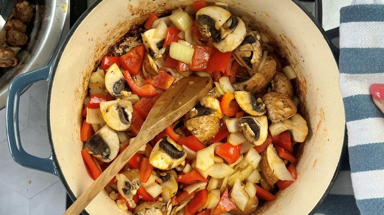 - Reduce heat to medium. Add onion, garlic, bell peppers, and mushrooms. Saute for 2 minutes.