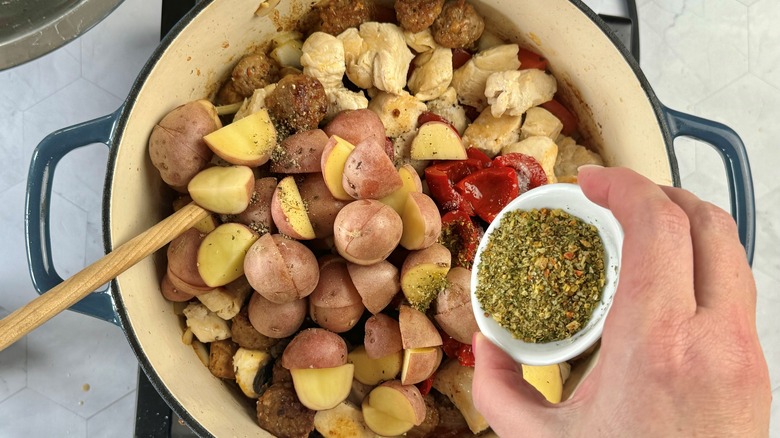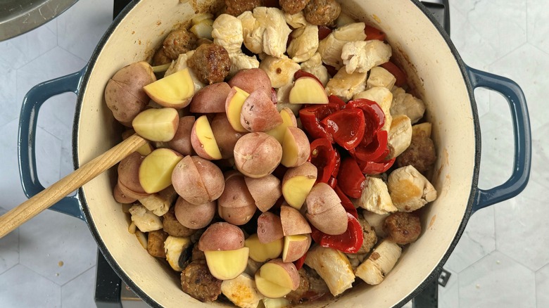 - Return chicken and sausage to Dutch oven. Add chicken stock, Peppadews, brine, and potatoes.