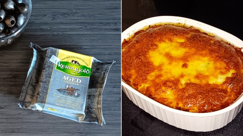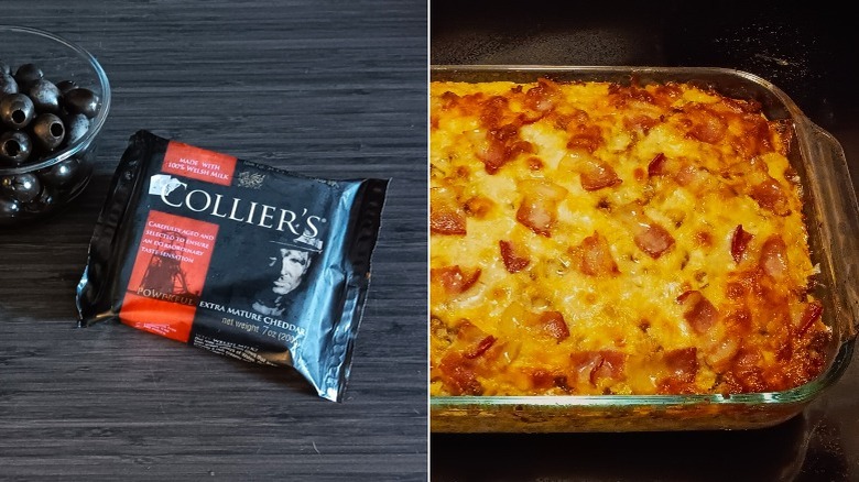 Collier's cheddar is known for containing crunchy little bits in its cheddar squares. Though you may think they're salt crystals, the little crunchy bits are actually calcium lactate grains that developed through the aging process. We tried Collier's, and it does indeed have crunchy little bits in the block of cheddar that adds to your snacking experience. This writer also created a cheesy, sirloin steak, bacon, and egg casserole to try Collier's in a recipe. The extra mature cheddar was shredded and sliced, and then layered in the casserole. True to a deep cheddar, Collier's added flavorful depth and creaminess, which held up to the strong combo of steak and bacon.