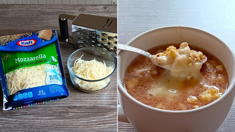 Offering various types of cheese from sharp cheddar to hot habanero, Swiss to provolone, and muenster to havarti, Kraft's cheese selection also includes blue cheese and feta cheese. With so many choices to select for this write-up, we went with a favorite of many: shredded mozzarella. Who doesn't like the mild, creamy, cheesy taste of mozzarella with its melty, stringy goodness? We topped a bowl of beef and egg soup with the mozzarella, and it didn't disappoint.