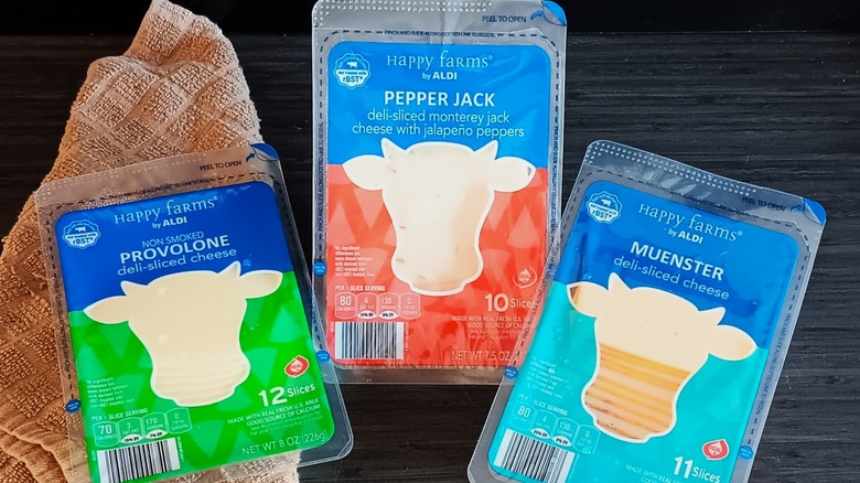Whether you're looking for the best grilled cheese around or are sticking to a budget and want to make grilled cheese at home, there are options for both. The Aldi brand Happy Farms is another popular choice selection of cheese. The entire deli section of Aldi showcases a number of cheese types and styles, including charcuterie combinations. From your standard cheddar to provolone to pepper jack, Aldi offers slices for your grilled cheese sandwiches, sticks and cubes for snacking, and shreds for cooking.