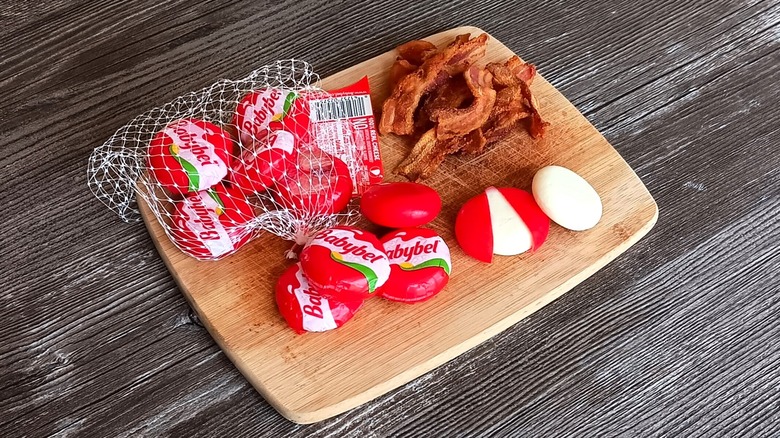 The original Babybel cheese is encased in a red wax that you peel to reveal the soft cheese inside. The wax is to help preserve the cheese for a longer life. But really, how long does cheese stay around when it's in your fridge? We purchased some original mini Babybel cheese rounds, and yep, they didn't last long since they were so convenient to snack on. We enjoyed the soft, mild cheese alongside some bacon. The sweetness of the Babybel went well with the smoky saltiness of the bacon.