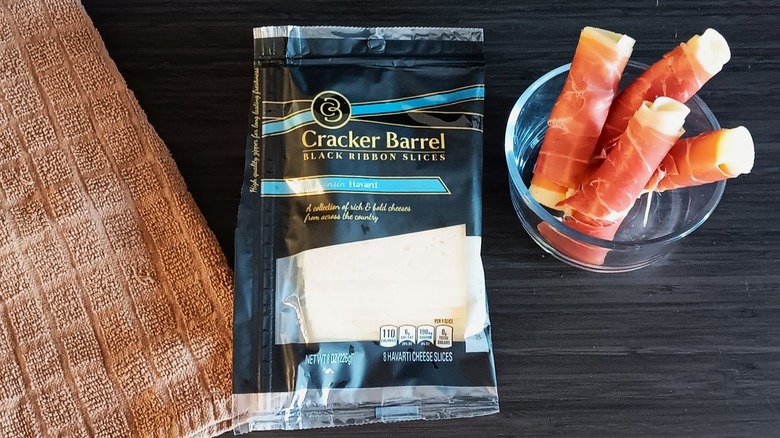 Cracker Barrel cheese features blocks, slices, cracker cuts, cubes, sticks, shreds, bites, and pairing boards. The blocks feature artisan flavors such as truffle cheddar and dill havarti, as well as mild, sharp, and extra sharp white or yellow cheddar. The varied selection also offers marbled, sharp Vermont, asiago, baby Swiss, and gouda. Shreds include double cheddar, three cheese blend, and mozzarella. We enjoyed some Cracker Barrel sliced havarti rolled up with prosciutto.