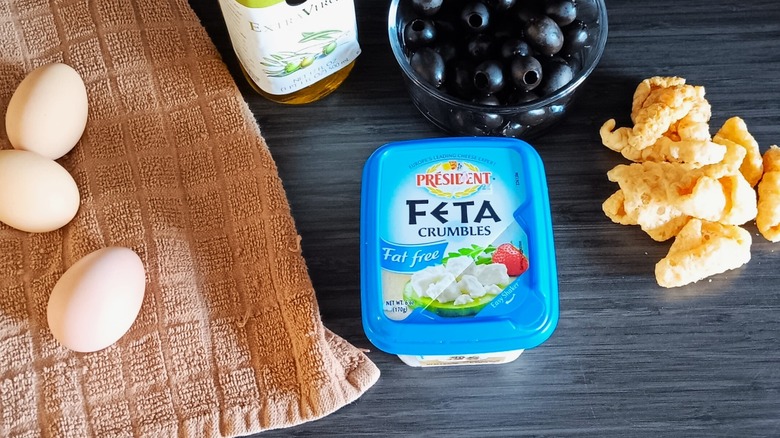 Because we were shopping in local grocery stores, we didn't have much option when it came to Président's varied offerings. We chose the popular feta cheese, which was only available as fat free, and picked up some Kalamata black olives to accompany it. Being a fan of pork rinds as well, we created a little snack bar to taste test the feta. We scooped the feta with the pork rinds, and the cheese was tangy and salty but dry since it was lacking fat. Then we drizzled olive oil over the feta to enhance the combination. This made for a tasty, filling snack.