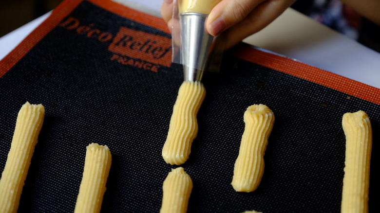 Fortunately, if you don't have a piping bag, you can use a large resealable plastic bag as a substitute for making eclairs. Here's how: fill the bag with your dough, and push it toward one corner. Then, snip off a corner of the bag — the size of the cut can vary depending on whether you're making mini or regular-sized eclairs. After that, you're ready to pipe!
