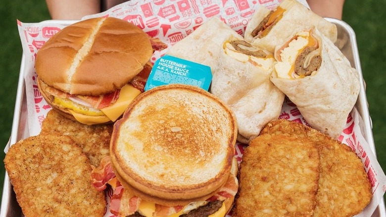 Although the menu isn't as extensive compared to other fast food chains, the SuperSONIC Breakfast Burrito manages to stand out and elevate the breakfast menu in what could have been an average menu lineup. The burrito is made up of typical breakfast items like eggs, cheese, and sausage, but Sonic delivers a savory twist with the addition of jalapeños, tomatoes, onions, and tater tots wrapped up in the tortilla. Over the years, Sonic has tried to diversify its breakfast menu by bringing back the fan-favorite pancake on a stick in 2017 as well as adding egg whites in 2013 as a substitute for any breakfast item featuring eggs. However, we docked points because the pancake on a stick returned for a limited time, and the healthy egg alternative is no longer available for customers hoping to cut calories.