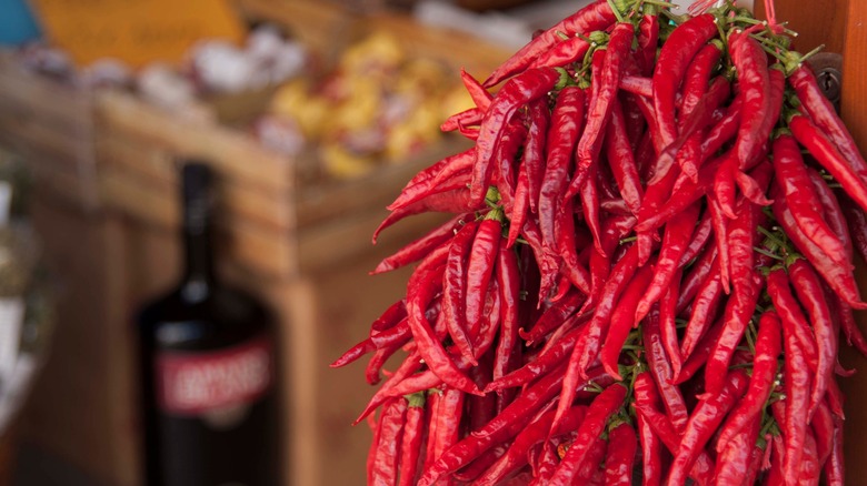 Make no mistake: Spaghetti aglio e olio gets a makeover with Calabrian peppers, even as a topping rather than an essential ingredient. With a Scoville Heat Unit (SHU) rating of 25,000 to 40,000, they're many times hotter than jalapeño peppers and only slightly milder than cayenne peppers. But the heat level of Calabrian peppers isn't the primary transformer — it's the deeply nuanced spicy flavors tucked within those bright red skins.