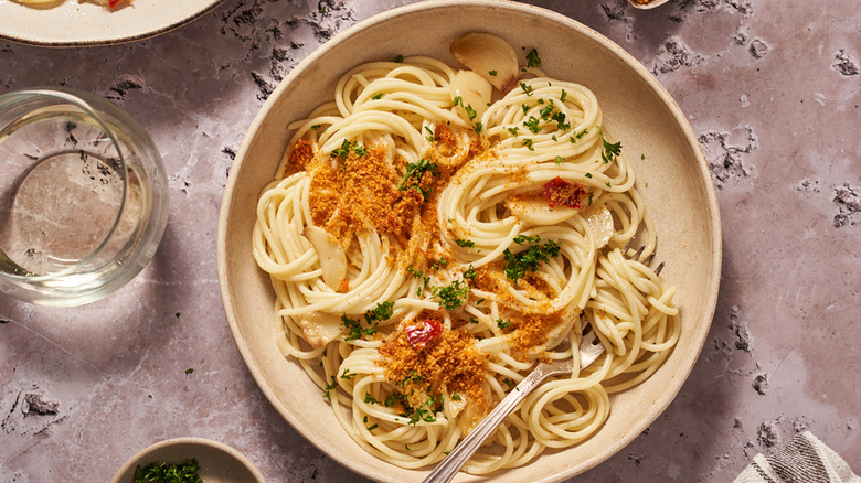 However, even those devoted to authentic three-ingredient interpretations of spaghetti aglio e olio might like to spice things up occasionally. Some chefs do that with Parmesan cheese, black pepper, or crushed chili flakes, which changes the composition slightly or considerably, depending on the number of toss-ins. Then there's another approach: Keep the core ingredients of spaghetti, garlic, and olive oil for the dish, but add a spicy spin with a topping. That's exactly what takes place in a Tasting Table recipe featuring Calabrian chili peppers and breadcrumbs.