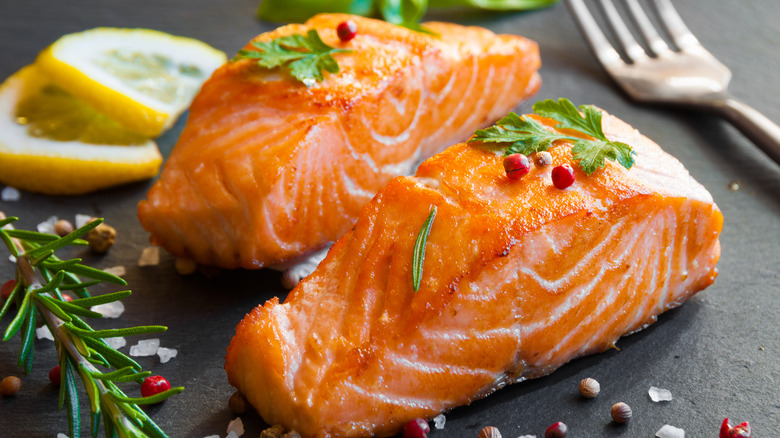 Without the fatty skin to protect the filet from the hot cast iron skillet, you'll need to use slightly lower heat to cook a skinless salmon filet — medium to medium-low setting works best. When the pan is too hot, the proteins in the fish can bond to the metal, even when the skillet is properly preheated. Your goal is enough heat to create a thin layer of steam between the filet and the pan from the moisture in the fish, and high heat will boil that off too quickly. Once the fish is placed in the skillet, avoid touching it and allow the heat to form a crust on the fish. When it's time to turn the filet, use a wide flexible fish spatula for best results. The width of a fish spatula supports the delicate meat as you flip it. A very thin piece of salmon might not even need turning — cooking on just one side and basting with hot butter or popping the cast iron skillet in a warm oven is enough to cook the fish through.