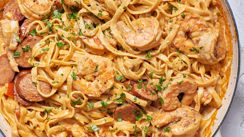 This spicier take on a fettuccine Alfredo is packed full of flavor, veggies, and protein, making for a complete, one-pot meal. The onions, celery, and bell peppers boost the visual appeal and crunchiness of the dish, while the shrimp, along with andouille sausage, make it extra filling for a weeknight or date night dinner. This spicy yet creamy pasta dish is best served with lighter sides such as roasted carrots, zucchini, or okra.