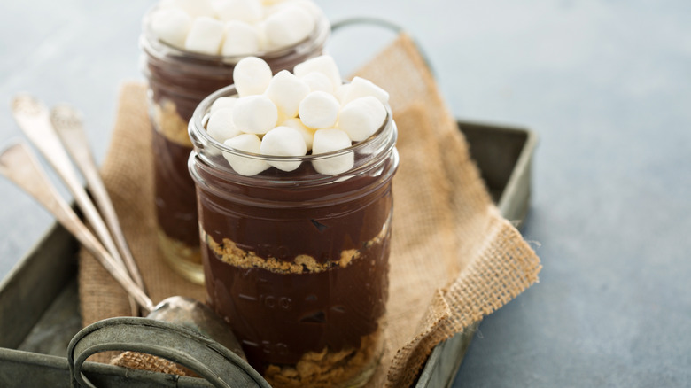 Marshmallow fluff goes with just about any pudding flavor, whether you choose pistachio, butterscotch, chocolate, or strawberry. Pour your desired pudding into the container you're going to eat it out of, such as a bowl or cup, then alternating layers of pudding and marshmallow fluff. This breaks up the flavor and texture as well as the aesthetics. Both the fluff and pudding are creamy, so give it an additional bite by including something like crushed cookies, chocolate chips, or chopped nuts. Instead of individual servings, make it a larger batch in a glass casserole dish to bring to a party.