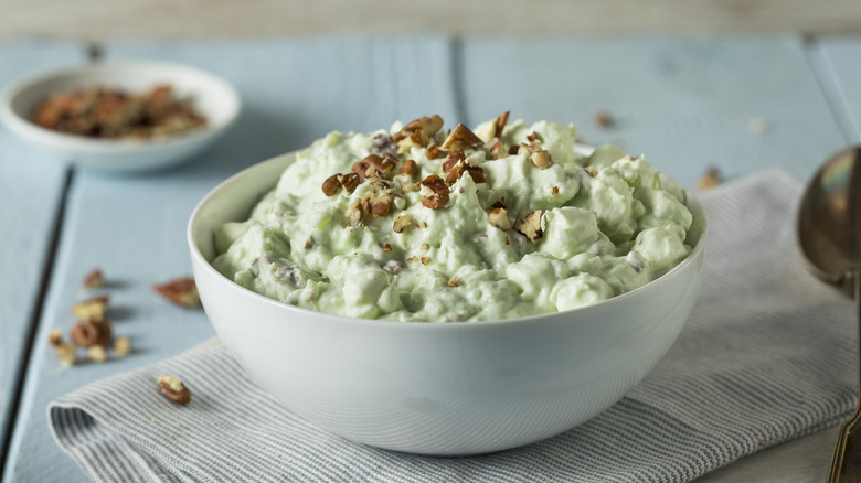 Ambrosia salad is another way to use crushed canned pineapple, mandarin oranges, maraschino cherries, and coconut for a colorful confection to bring to a potluck. The marshmallow fluff complements the marshmallows that are already in the dessert. Similarly, you can replace the whipped topping in a Watergate salad. There's pistachio, pineapple, and marshmallow, so the fluff swap makes a lot of sense. Substitute whipped topping for marshmallow fluff in your favorite fruit-based salad.