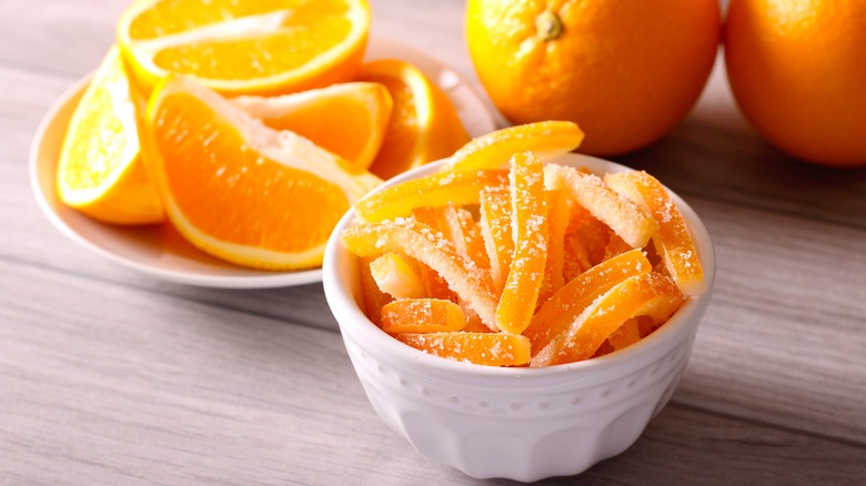 Although candied fruit peels are typically available with citrus, your choices are hardly limited. There's lemon, grapefruit, pomelo, kumquat, tangerine, and quite possibly the most popular — orange. You won't have a hard time finding pre-made packages at supermarkets and the like, but feel free to whip them up at home for a more tailored taste. Apart from the fresh fruit peels, you'll only need a few fundamentals such as sugar, water, and a bit of time.