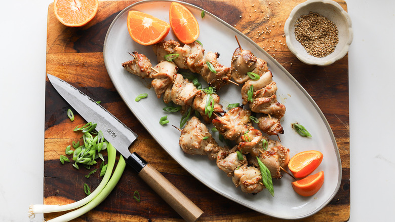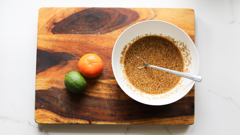 The secret to making chicken skewers that aren't bland is all in the marinade. After sourcing some boneless, skinless chicken thighs and cutting them into strips, gather the ingredients for the marinade. There's a bit of soy sauce, honey, tahini, sesame oil, and chile flakes for a bit of spice. The tart flavor comes from a combination of fresh lime and tangerine juice, which gets whisked into the marinade. A showering of toasted sesame seeds adds a nutty crunch, and you can optionally finish the dish with some sliced green onions.