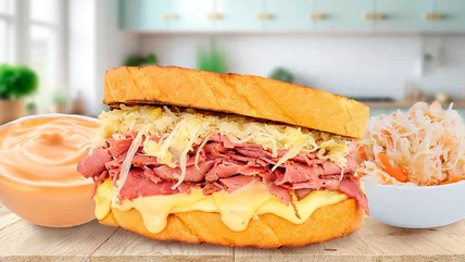 There are variations on Reuben ingredients depending on where you go, which use pastrami or turkey instead of corned beef, or Thousand Island dressing instead of Russian dressing. Rye is the standard bread choice, but some people use sourdough or different types of rye, like marbled, dark rye, or pumpernickel. Then there are the unconventional takes on it, like the redneck Reuben with beef brisket and barbecue sauce. However you make this sandwich can be completely customizable (albeit untraditional) if you follow the basic formula for a Reuben, choosing a sturdier or maltier bread, salty meat, cheese, a tangy dressing, and a pickled salad.