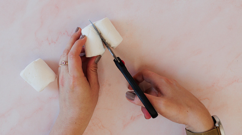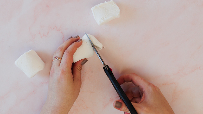 - Cut the other giant white marshmallow into quarters diagonally to create elongated ear shapes.