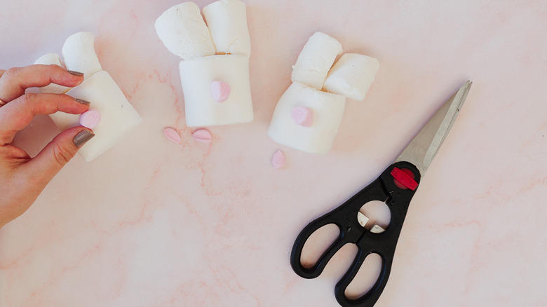 Cut the other giant white marshmallow into quarters diagonally to create elongated ear shapes.