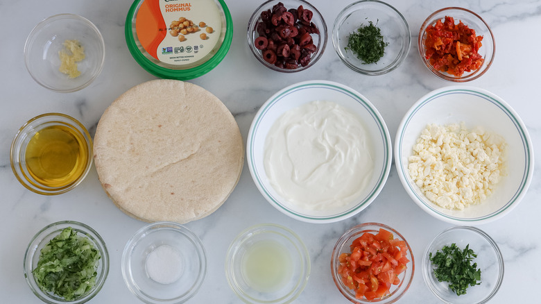 Two of the recipe components here are homemade: the pita chips use a simple mix of pita bread, olive oil, salt and pepper, and the tzatziki is made with cucumber, yogurt, lemon juice, olive oil, garlic, salt, and dill. There are different types of cucumbers you can use for tzatziki, but whatever you choose, make sure you drain the liquid out, otherwise the dip can end up watery. Then, you just need Kalamata olives, roasted red peppers, feta cheese, tomato, hummus (store-bought or homemade), and parsley for topping.