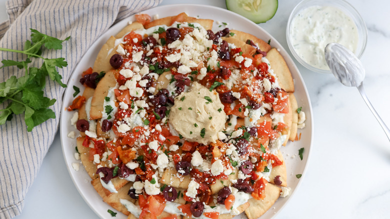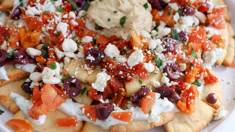 When you think of nachos, you usually first think of the traditional version with tortilla chips, cheese, and toppings of your choice. However, different kinds of nacho options are just as delicious. For example, you could try Irish nachos or even apple nachos. This version of nachos from recipe developer Jessica Morone is a Mediterranean take on the classic dish. These loaded Mediterranean nachos use homemade pita chips and tzatziki, along with a bunch of Mediterranean toppings, for an easy, quick appetizer that is bursting with flavor.