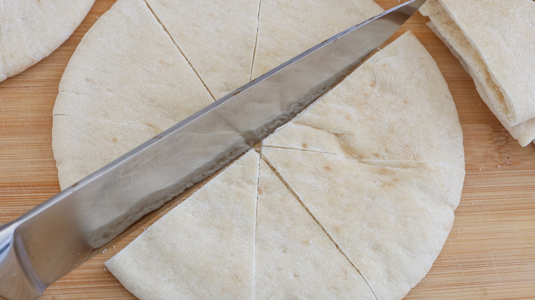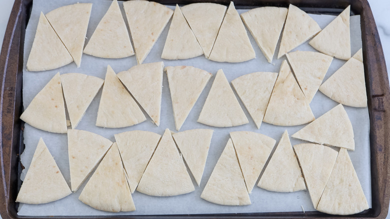 Arrange the cut pita triangles evenly on a baking sheet lined with parchment paper.