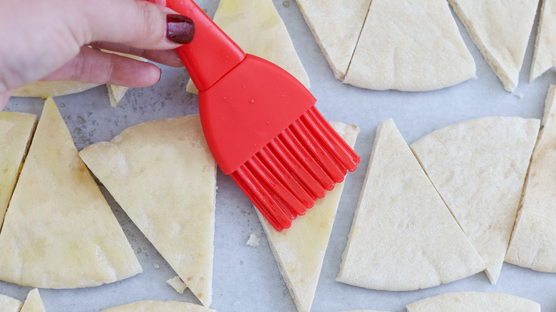 - Brush the pita triangles on each side with olive oil (about 3 tablespoons total).