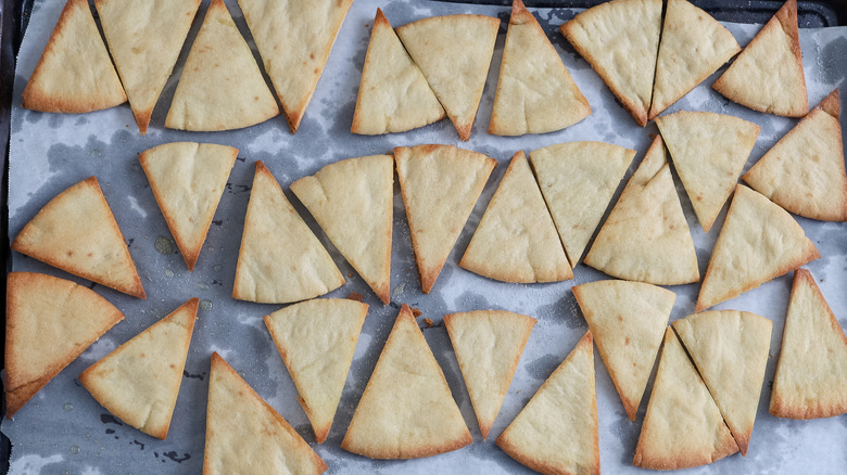 - Arrange the cut pita triangles evenly on a baking sheet lined with parchment paper.