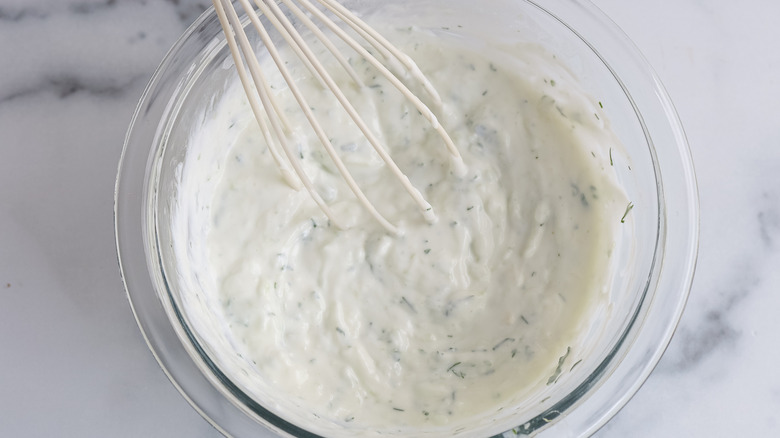 - While the chips bake, in a medium bowl, whisk together the cucumber, yogurt, lemon juice, ½ tablespoon olive oil, garlic, ¼ teaspoon salt, and dill until combined.