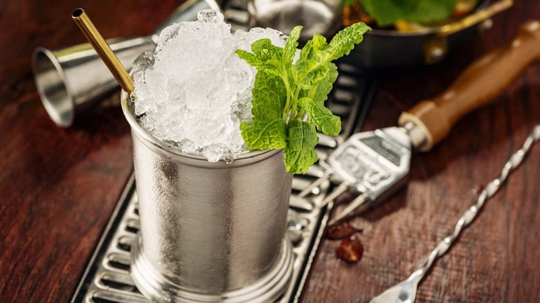 Add simple syrup and a handful of fresh mint leaves to a silver mug or your preferred cup. Crush the mint leaves with the back of a wooden spoon to release the oils in the mint. Pour half the desired whiskey into the cup and top it with crushed ice. Stir the contents to mix the ingredients. Top the glass with the second half of the whiskey. And for a finishing touch and a little extra St. Paddy's Day cheer, decorate the glass with a sprig of fresh mint.