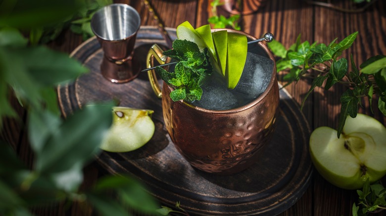 To get your Irish mule cheer on for St. Patrick's Day, fill a copper mug with ice and add your desired amount of Irish whiskey over the ice. Top the mug off with a healthy pour of spicy ginger beer and a squeeze of fresh lime juice. A lime slice and a sprig of fresh mint make for a very green final touch. For another twist to the classic mule, add a few slices of green apple to the bottom of the mug before making the drink. The green apple adds tart and juicy notes that balance a smooth Irish whiskey, the bite of spicy ginger beer, and the citrus of the lime. The extra splash of green is a welcome touch for the occasion.