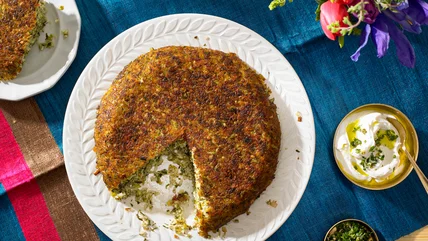 Another important step to take for a crispy pita tahdig is to wrap the cooking pot top in a cloth towel before steaming the parboiled rice. The cloth will absorb the wet steam, thereby ensuring fluffy, separate rice and a crunchy pita. The crunchy pita goes from the bottom of the pan to the top of the rice dish in a single, decisive flip of the cooking pan. If the pita cracks or breaks during the flip, it'll just make it easier to portion and serve the rice. Since the rice will continue to emit steam even after you flip it into the serving dish, you'll want to eat the tahdig as soon as it's done. Otherwise, the residual steam will infiltrate the topping as it rises, resulting in a rehydrated pita that's lost its crunch.