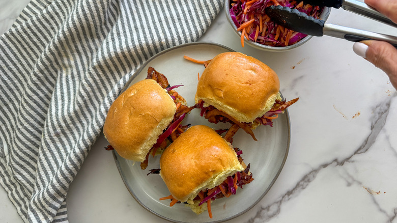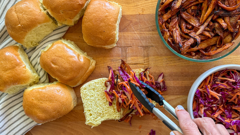 Assemble the pulled mushrooms on the buns, top with the slaw, and serve.