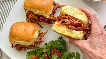 Sliders are not only fun to eat, but they're also a perfect option for picnics, outdoor events, and tailgating parties, providing a portable and easy-to-eat meal option that doesn't skimp on flavor. These vegan barbecue pulled mushroom sliders are a plant-based twist on a classic barbecue favorite and promise to also satisfy the meat eaters in the group. Bursting with savory flavors and hearty textures, these sliders are as wholesome as they are delicious. Featuring tender king oyster mushrooms marinated in a savory blend of soy sauce, apple cider vinegar, and aromatic spices and then tossed in a homemade barbecue sauce, each bite is a blend of smoky, tangy, and sweet notes. Topped with a vibrant slaw of shredded cabbage and carrots, dressed in a light and tangy vinaigrette, these sliders offer a refreshing crunch that perfectly complements the rich flavors of the mushrooms.