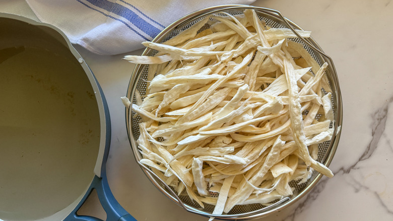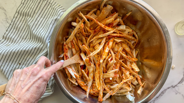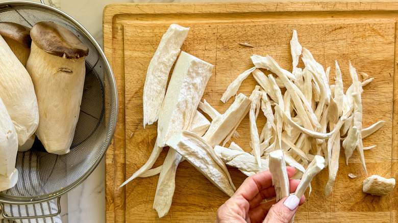To shred oyster mushrooms, start by tearing the stems into thin strips almost like you are peeling string cheese. "It can be helpful to cut the thick stem in half lengthwise to make it easier to start the peeling," Hahn explains. The steaming step is important here as it helps to soften the fibers in the mushrooms, resulting in a tender and juicy texture.