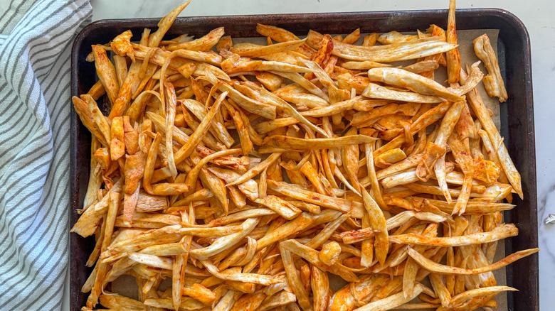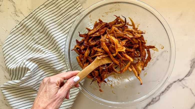 Spread the shredded marinated mushrooms on a sheet pan and bake for 20 minutes.