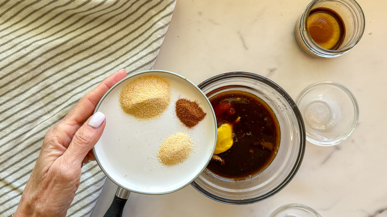 - In a small bowl combine the ketchup, 1 ½ tablespoons vinegar, Worcestershire sauce, brown sugar, yellow mustard, onion powder, garlic granules, and chili powder to make the barbecue sauce.