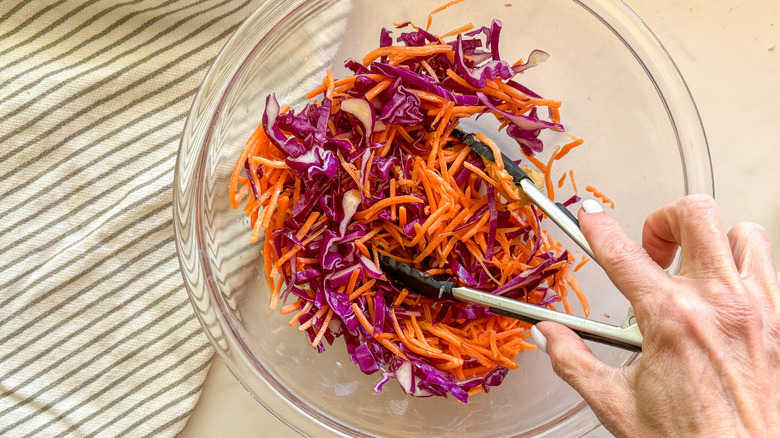 - In a medium bowl combine the shredded cabbage, carrots, olive oil, remaining vinegar, maple syrup, Dijon mustard, and salt.