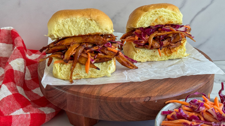 - Assemble the pulled mushrooms on the buns, top with the slaw, and serve.