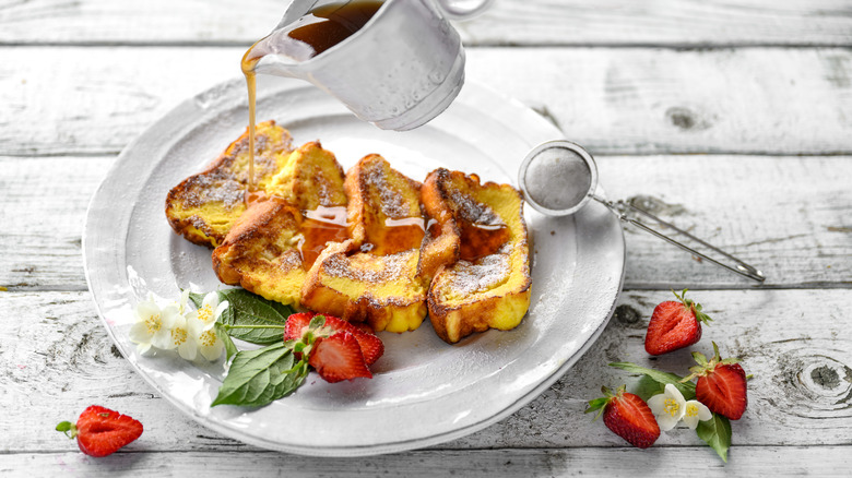 While a delicate French toast recipe can easily steal the spotlight at an elegant brunch table, Canadian French toast has huskier origins. Chefs working at logging camps would soak stale bread overnight and fry up the pieces in the morning to serve hardworking lumberjacks. To start the day, energy-packed meals were consumed, and fried, golden pieces of eggy bread were perfect companions to juicy slabs of ham and bacon. Also called pain dore, golden bread, Canadian French toast looks gold once fried and covered with maple syrup. Along the streets of Quebec, you'll find pan-fried pieces topped with syrup, cinnamon, and brown sugar to dial up the intensity of the golden color.