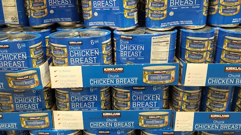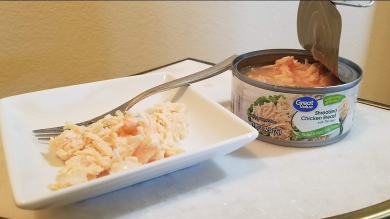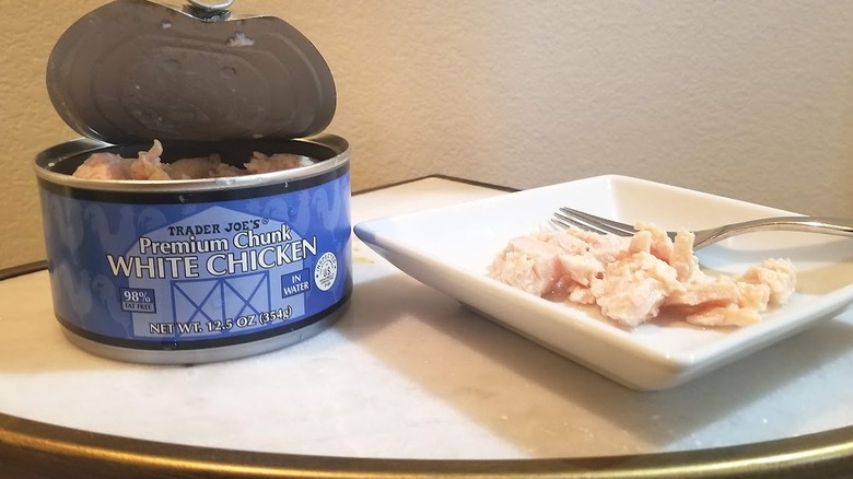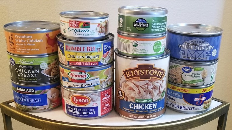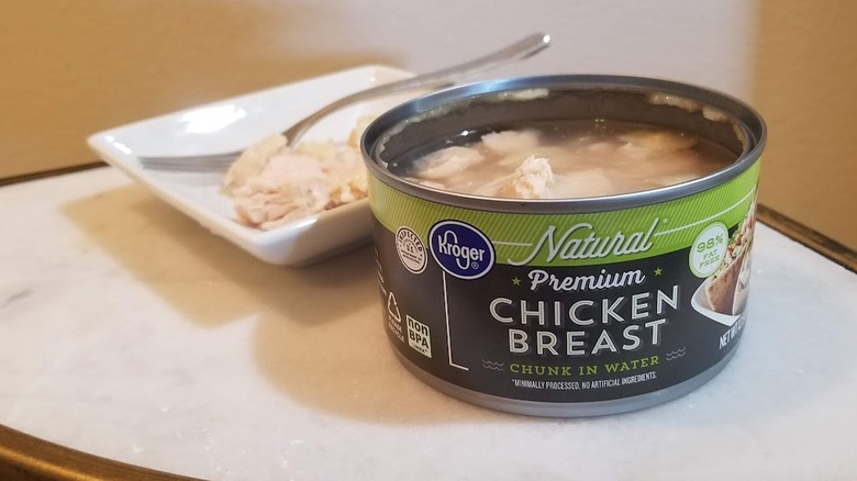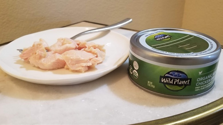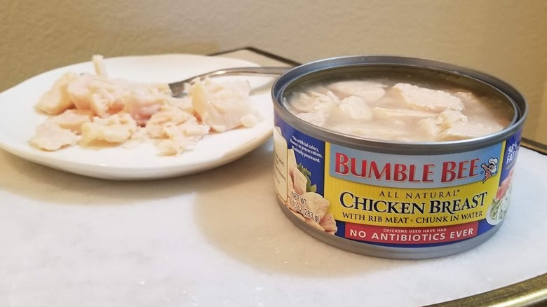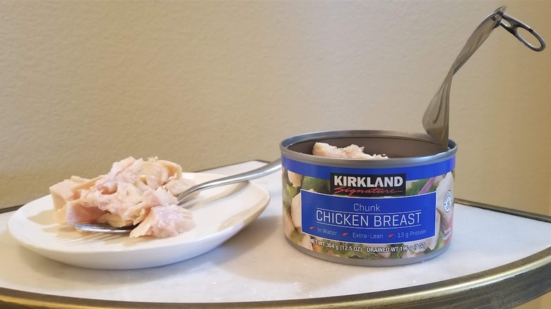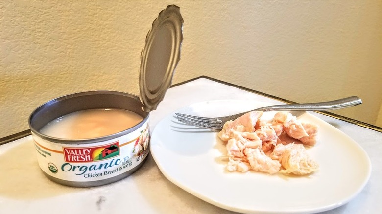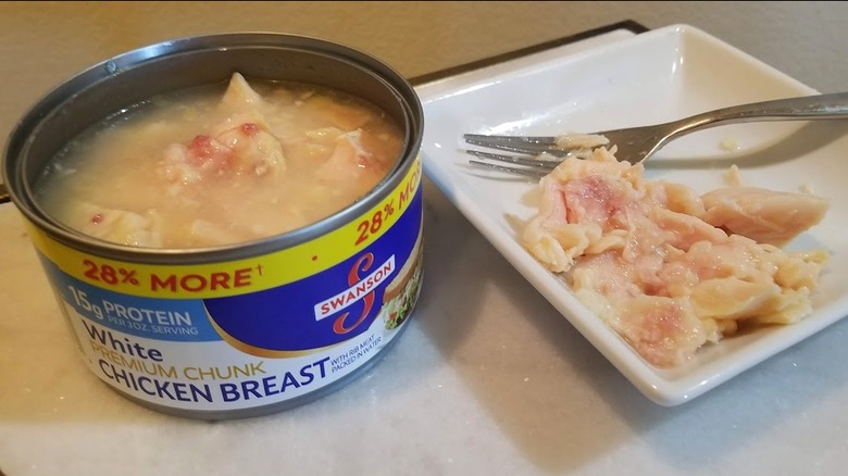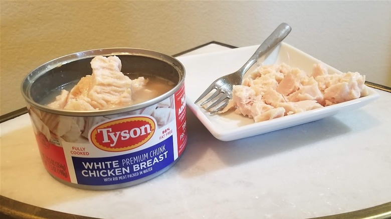 Tyson Foods is a big name in the poultry world. It offers many different chicken products, from breaded frozen chicken nuggets to whole chickens, and, of course, canned chicken. The latter is available in white meat chicken breast, grilled white meat chicken breast with smoked flavor, and a mix of white and dark meat. We decided to taste the white premium chunk chicken, which contains 19 grams of protein in each 3-ounce serving.
