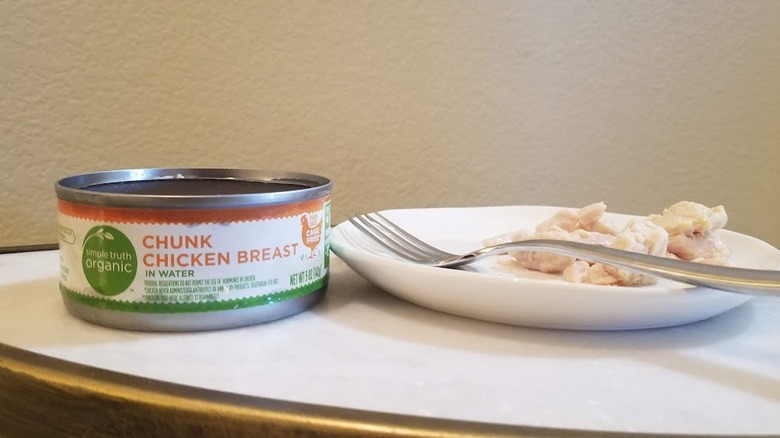 Kroger's private label brand, Simple Truth Organic, offers an organic premium chunk chicken breast with only 45 calories and 270 milligrams of sodium per 2-ounce serving. We were looking forward to trying the product as the label guarantees the chickens were grown in a cage-free environment and were fed a vegetarian, organic diet. The ingredient list includes only cooked chicken breast meat, salt, and water, without additional preservatives.