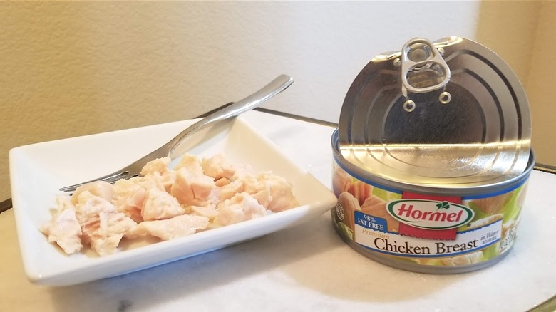 Hormel has been an innovator and leader in the canned meat industry for over 130 years. The name is synonymous with products like canned ham, chili, and, of course, Spam. However, it may not be the brand that comes to mind when considering canned chicken — even if the company has been producing it for almost as long as it has been canning hams. Like all of Hormel's products, canned chicken aligns with the company's goal of providing delicious and nutritious ready-to-eat meat products.
