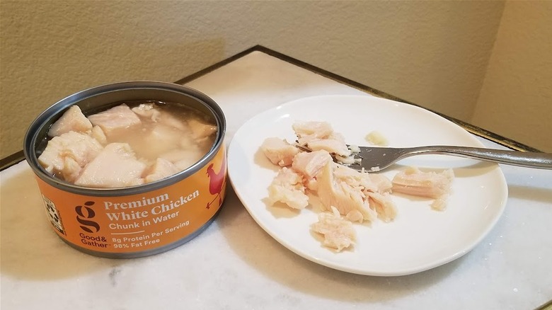 Target's Good & Gather label aims to provide consumers with high-quality products at a more affordable price than name-brand items. The brand's canned chicken options are limited to only one variety: premium white chicken chunks in water. The canned chicken is quite inexpensive, with the company's 5-ounce can priced at $1.29 and 10-ounce size available for $2.29, which is on par with Walmart's Great Value chicken.
