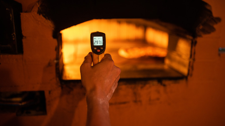 One safe and simple way to gauge the temperature is to use an infrared thermometer — a small gun-like device that allows you to read the temperature without touching the oven. Simply point it at the oven's floor and take a reading, then add about 100 degrees Fahrenheit to account for the heat's intensity. To ensure even heating, take several readings from different parts of the oven and adjust the heat distribution accordingly. The perfect temperature can vary based on the pizza type and size but, generally, the oven should be ready at 700 to 1000 degrees Fahrenheit.