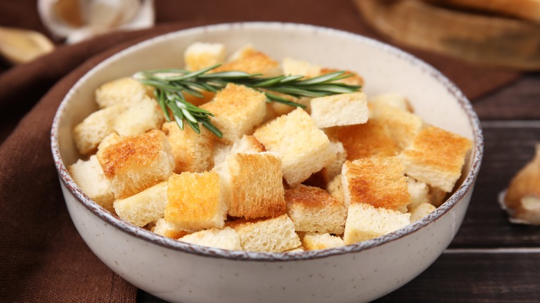 There are hundreds of ways to cook chicken breasts, but it's hard to beat crunchy breaded chicken. The contrast of the bronze, crispy outer layer with the tender and moist white meat is irresistible. Whether you're making crispy chicken cutlets for dinner, or air frying a batch of chicken tenders to eat during the big game, the process is the same — creating a flavorful layer around the chicken that stays on during cooking. You'll find crust-making recommendations that range from breadcrumbs to smashed potato chips and cracker bits, but crushed, seasoned croutons are one of the best options and they might already be waiting in your pantry.