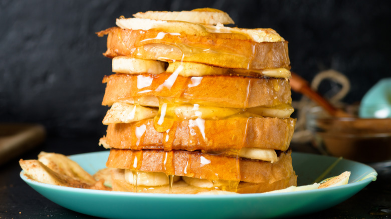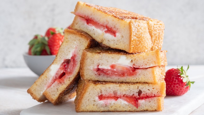 French toast is an iconic brunch item usually made of bread, eggs, vanilla, milk, and sugar. Of course, there are some variations, but that's the general gist of it. You don't have to get stuck using white bread; you can always swap the bread with French baguette, sourdough, challah, or something else. No matter what bread you pick, dried bread is the key to French toast so that it can soak up the eggy custard mixture. We'll dive into some of the best ingredients to stuff French toast with when you want delicious ways to mix up how you do breakfast.