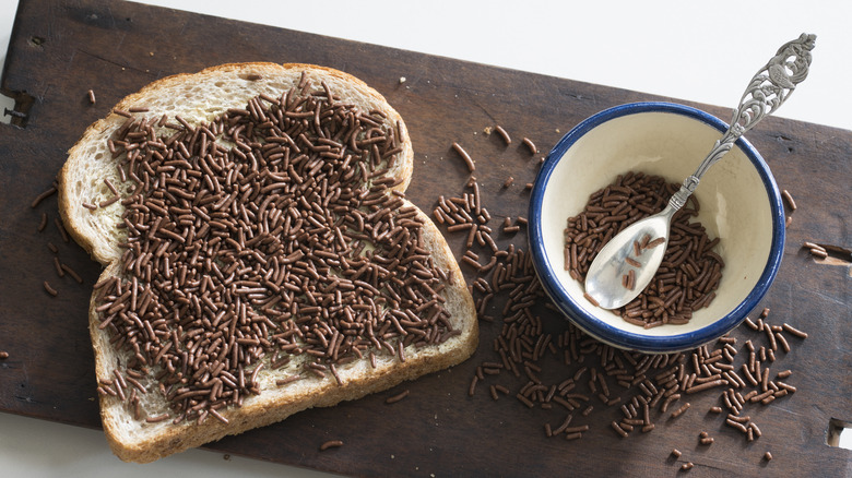 Believe it or not, sprinkles and bread are a dynamic duo that is beloved by various countries such as the Netherlands and Australia. Hagelslag are the sprinkles that the Dutch love adding to bread, and in Australia, you'll find fairy bread, a delightful treat for all ages. You can use rainbow sprinkles, chocolate sprinkles, or any type of sprinkles for this concoction. Generously slather butter on your bread and then add an even layer of sprinkles. Place the second bread on top to make a sandwich, and then you're ready to dip in the egg mixture.
