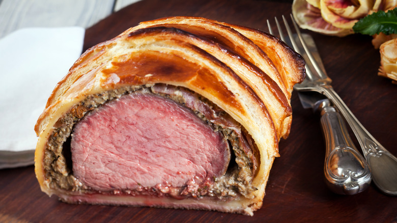 Among the many steps you'll want to master to make beef Wellington, one of the most important is learning to cook the expensive tenderloin correctly. Ideally, tenderloin should not be cooked past medium because the lean meat will be dry and tough when overcooked. Properly roasted, the beef has a rosy pink interior that stays moist — an impressive look when you slice the Wellington. The key is to only sear the raw tenderloin long enough to develop a flavorful crust before wrapping it in the mushroom and puff pastry. The remainder of the cooking happens while the Wellington roasts in the oven. You'll find the meat perfectly cooked when the puff pastry is golden brown and crispy.