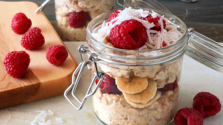 Prefer your oatmeal served warm and fast? Simply heat a fresh batch and layer it into a cup or jar with your favorite toppings. From berries and jam, to bananas and peanut butter, or perhaps cacao nibs and coconut flakes, there's no limit to what you can combine in your oatmeal parfait. Make it fruity and fresh, or turn it into a treat worthy of your sweet tooth. You can even go the more traditional route and add alternating scoops of yogurt to break up the starch if you wish. In any case, you'll be left with a wholesome, filling, and nutrient-packed snack that not only tastes good, but also looks like it belongs on a dessert platter.