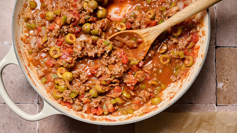 What makes picadillo such a popular dish is its versatility. Besides tacos, picadillo can be eaten on its own or over a bed of rice and beans. Because it's a mixture of ground beef and tomato, picadillo also pairs well with mashed potatoes in a fashion similar to an Irish shepherd's pie. You can also serve picadillo for breakfast: In some countries, it's not uncommon to find picadillo served with a fried egg on top, which makes an excellent breakfast as tacos or in a skillet.